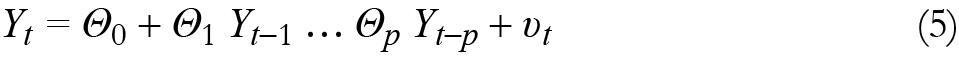 Donde: Yt = vector de dimensiones m × 1; Θ0= vector de ordenadas al origen; Θ1,…, Θp = matrices de parámetros desconocidos; Yt-1,…, Yt- p representan el primer y p-esimo rezago del vector m × 1 Y y υt = vector aleatorio de error.