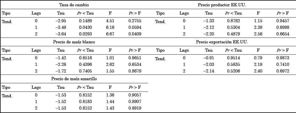 Las series de tiempo de precios de maíz blanco, precio de maíz amarillo, precio de exportación ee. uu., precio al productor ee. uu. y tasa de cambio fueron exploradas por la presencia de raíz unitaria bajo el principio de la prueba Dickey y Fuller, de donde se concluye que no se puede rechazar la hipótesis nula de raíz unitaria (anexo A1). Aunque para la tasa de cambio la hipótesis de raíz unitaria rechaza al 5%, en la versión aumentada de la prueba con tendencia y dos rezagos de corrección esto no ocurre para el periodo base o cero ni el primer rezago y se concluye no rechazar la hipotesis de raiz unitaria. Por otra parte, es de notar que la tasa de cambio presenta tendencia y por lo tanto se empleó la estadística tipo F para apoyar tal conclusión.