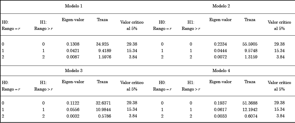 El anexo A2 muestra los resultados de la prueba de cointegración empleando la estadística de la traza. En cuanto a interpretación, se compara esta última estadística con el valor crítico, si es mayor (menor) se rechaza (no rechaza) el rango examinado.