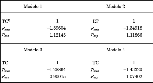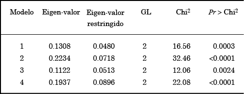 En los cuatro modelos ensayados se rechaza la hipótesis de cero vectores cointegrantes; sin embargo, no es posible rechazar la hipótesis de que existe un vector cointegrante. Este resultado se puede emplear en el contraste de la ley de un solo precio.