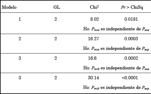 Para las cuatro posibles combinaciones se rechaza la hipótesis de exogeneidad débil del precio ee. uu. Esto implica que el coeficiente asociado al precio de ee. uu. respecto al vector denominado como α o de ajuste es diferente de cero; con ello, una desviación del equilibrio conformado por la lpu requiere de información del precio ee. uu. para encontrar su valor al momento t siguiente.