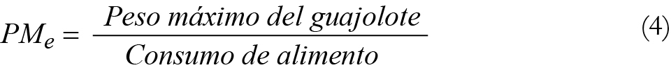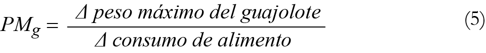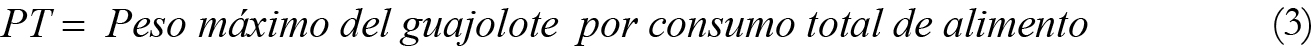 A partir de la productividad total ( PT ) o cantidad de bienes producidos por el total de factores utilizados (Pindyck y Rubinfeld, 2009), que se traduce como la ganancia de peso máxima óptima del guajolote obtenida del consumo total de alimento, se calculó la productividad media ( PMe ) o peso vivo promedio de guajolote obtenido por kg de alimento consumido, y la productividad marginal ( PMg ) o pérdida de peso por kg extra de alimento consumido, expresadas matemáticamente como: