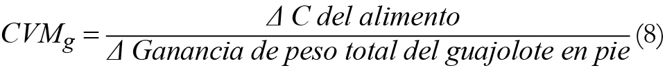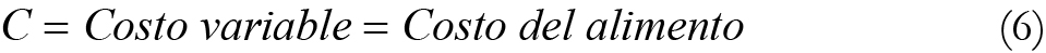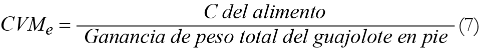 Con base en lo anterior, y partiendo del supuesto que los sistemas meleagrícolas manejan periodos de engorda de corto plazo equivalentes a 28 semanas que difícilmente podrían alterar la ganancia de peso esperada, la eficiencia económica se calculó considerando el sistema de producción como la tecnología, el alimento como el principal insumo, la ganancia de peso como el nivel de producción,1 el CMe como el costo promedio por kg de peso vivo y el CMg como el incremento en el costo por producir un kg adicional. Las expresiones matemáticas son:
