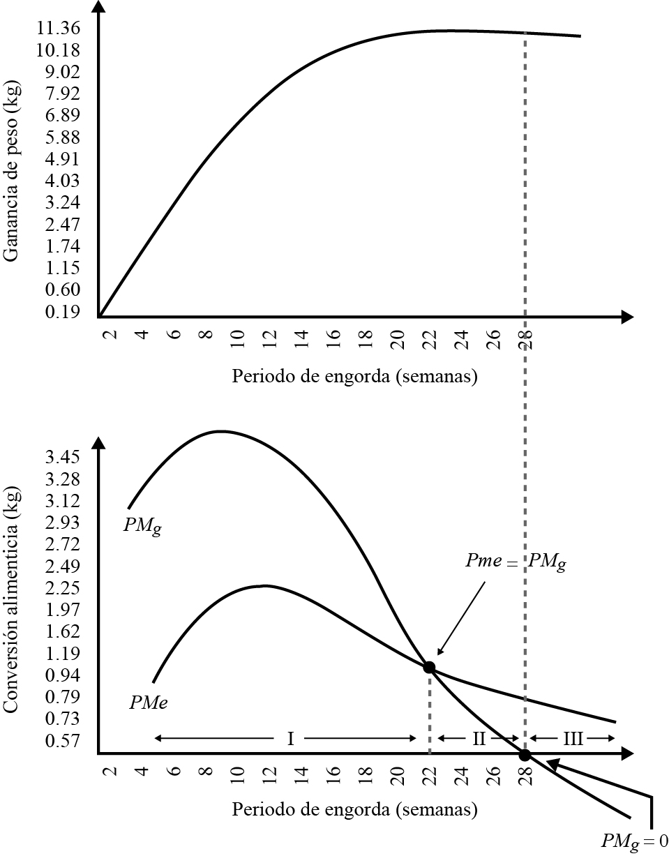 Donde, la ganancia de peso y el consumo de alimento están expresados en kg. Una vez obtenidas PT , PMe y PMg su representación gráfica e interpretación permitió identificar el comportamiento de los sistemas en cada una de las tres etapas: a ) dado que el guajolote se encuentra en fase de iniciación, crecimiento y engorda, se espera que la PT sea máxima, es decir, que la ganancia de peso sea mayor al aumentar el consumo de alimento. PMe es creciente pero menor a PMg ( PMg > PMe ). b ) Se espera que el guajolote alcance el peso vivo máximo óptimo para venta que en promedio es de 12 kg, y por consecuencia que la unidad meleagrícola obtenga la eficiencia técnica. PMe deberá ser decreciente y PMg > 0; por lo tanto, se espera que PMg < PMe . c ) Es la fase de finalización, por lo que ante el consumo adicional de alimento se espera que el guajolote baje de peso o, en el mejor de los casos, mantenga su peso. PMg es negativa ( PMg < 0) y PMe se mantiene positiva, pero con pendiente negativa.