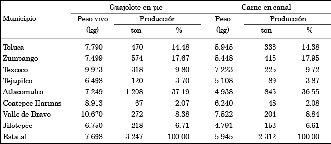 El crecimiento de la meleagricultura en 1.10% registrado en el Estado de México de 2002 a 2012 llevó a esta entidad a generar en promedio 3 247 ton de guajolote en pie y 2 312 ton de carne en canal al año y, por consecuencia, a ocupar la tercera posición a nivel nacional. A pesar de esto, la meleagricultura mexiquense se ha caracterizado por la dispersión y concentración de la producción, y por la diferencia en los rendimientos obtenidos de guajolote en pie y de carne en canal, ya que, Atlacomulco, Zumpango y Toluca aportaron en conjunto 69.34% de guajolote en pie y 68.88% de carne en canal (cuadro 1), mientras que los guajolotes con mayor peso vivo en pie y de mayor peso en canal se obtuvieron en Valle de Bravo, 10.670 y 7.522 kg respectivamente (siap , 2012).