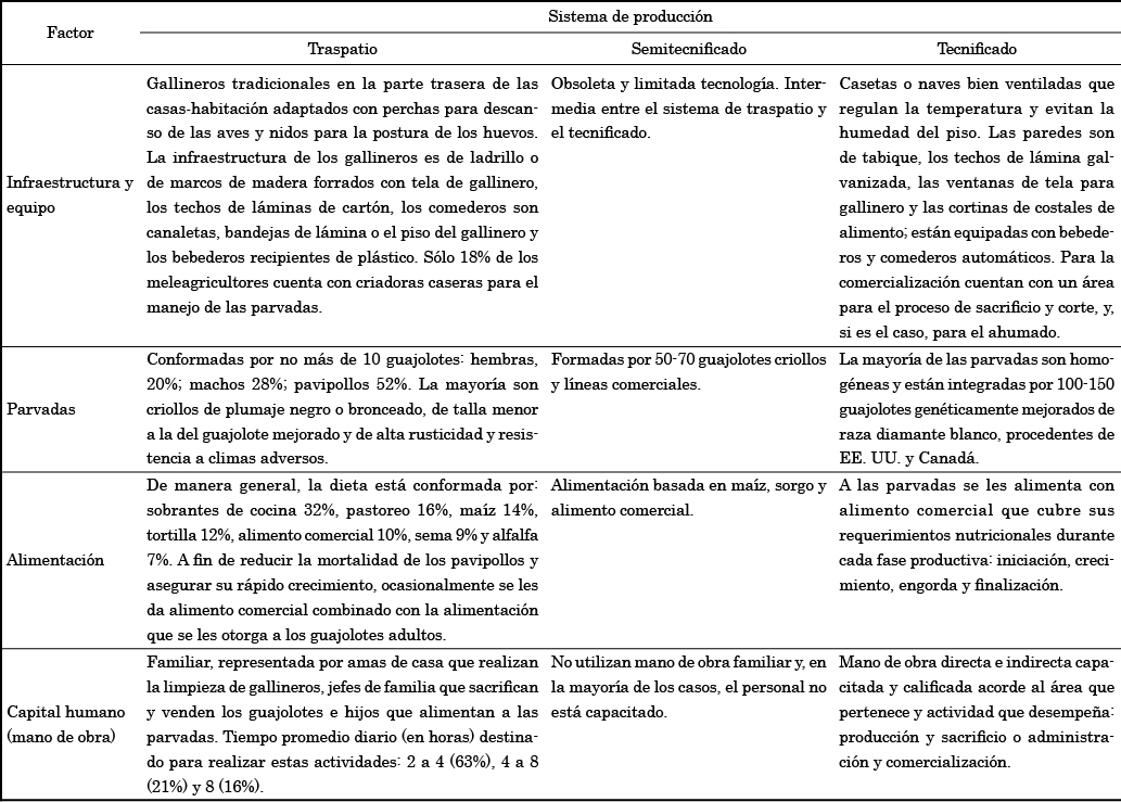A través del análisis de la producción de guajolote en el Estado de México se encontró evidencia de que esta actividad económica se realiza en unidades meleagrícolas que operan bajo tres sistemas de producción: traspatio, semitecnificados y tecnificados, resultados que coinciden con lo reportado por Díaz (1975) y Jerez et al. (1994), quienes refieren que la meleagricultura se realiza bajo tres diferentes escalas: a ) grandes unidades de producción que operan bajo sistemas tecnificados, b ) pequeños o medianos meleagricultores que basan su producción en sistemas semitecnificados y c ) microproductores que crían los guajolotes con métodos tradicionales en traspatio.