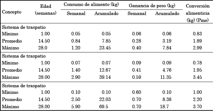 En las unidades meleagrícolas tecnificadas los guajolotes alcanzan el peso vivo óptimo entre la semana 22 y 23 con un consumo promedio de 63.3 kg, en las semitecnificadas entre la 27 y 28 con 32.6 kg de alimento (cuadro 5), y como resultado de una dieta desbalanceada en traspatio los guajolotes no alcanzan el peso vivo óptimo.