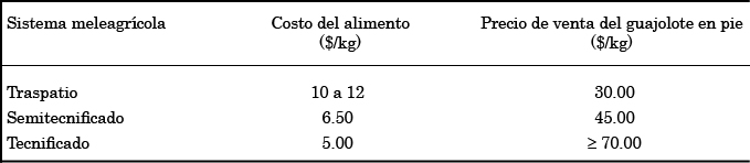Para la eficiencia económica, las variables analizadas fueron el costo del alimento y el precio de comercialización del guajolote en pie. De acuerdo con el cuadro 3, la relación entre las dos variables para las tres unidades meleagrícolas es positiva: traspatio 2.5, semitecnificada 6.9, tecnificada 14. Sin embargo, a esta utilidad bruta habría que restarle otros costos variables y los costos fijos para obtener la utilidad neta.