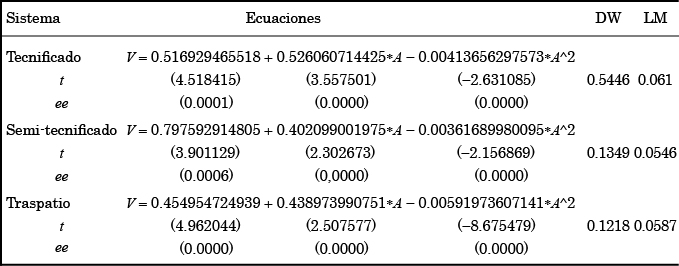 El análisis de los términos de error o residuales indica que las suposiciones asociadas con su distribución son aceptadas y, en relación con las ecuaciones de regresión o funciones de producción, se encontró que éstas se ajustan a las teorías económica y estadística, dado que los signos obtenidos fueron los esperados (cuadro 4).