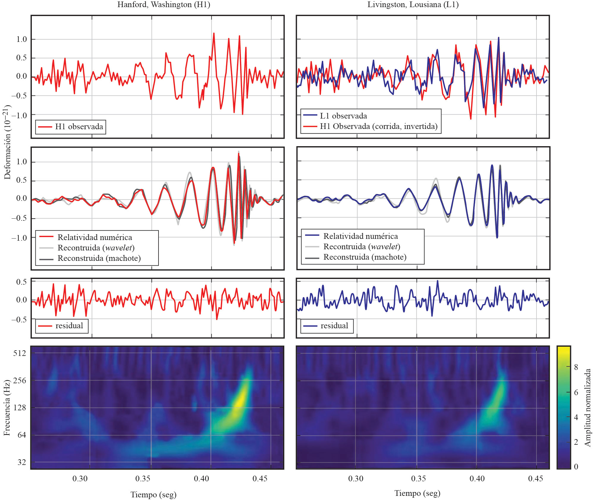 Finalmente, el 14 de septiembre de 2015 los interferómetros gemelos del proyecto ligo respondieron a la misma perturbación. Una perturbación del espacio en una razón de 1 a 1021. Tamaños miles de veces más pequeños que las dimensiones de un protón. La señal que registró la antena en Hanford, en Washington en la costa oeste norte de Estados Unidos, casi se empalma en magnitud y forma de las oscilaciones con la detectada por la antenna en Livingston, Loussiana, que la registró 7 ms antes (gráfica 1), una perturbación del espacio-tiempo que pareció provenir del hemisferio sur celeste. Es el resultado de la colisión y coalescencia de dos agujeros negros, uno con una masa de 29 veces la del Sol y el otro con una de 36 veces. Ocurrió hace 1 300 millones de años –la vida en la Tierra comenzaba apenas– y casi tres veces la masa del Sol fue transformada en una onda gravitacional en una fracción de segundo. El evento, al que se le llamó gw150914 (no se quebraron la cabeza para nombrarlo) duró 20 microsegundos. El pico de la potencia emitida fue cincuenta veces la de todo el Universo visible. Sería interesante imaginar cómo miraríamos al Universo si las ondas gravitacionales se pudieran ver, como vemos la luz. Otro detalle fue que al observar la señal, los expertos de la colaboración ligo no tuvieron dudas, era la colisión de dos agujeros negros muy masivos. Una vez extraída del ruido de fondo la señal tenía sus tres fases muy claras. Lo curioso es que si la señal se pasa tal cual a un aparato de sonido podemos escuchar el gorjeo de la perturbación. Es como estar escuchando en tiempo real al espacio-tiempo.
