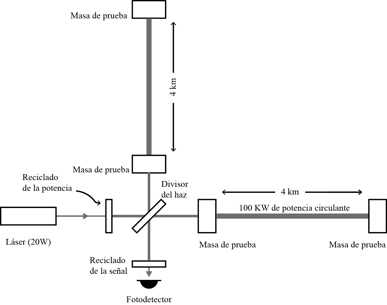 El proyecto ligo , concebido en 1970 pero inaugurado en 1999 gracias a los esfuerzos de Rainer Weiss, Kip Thorne y Ronald Drever, se basa en la observación de las ondas gravitacionales. Usa dos interferómetros gemelos separados 3 000 km, lo que permite determinar la dirección de llegada de la señal y además de que no es causada por un fenómeno local. Cada uno con la forma de la letra L, con brazos de 4 km de largo con tubos al vacío por los cuales atraviesa un rayo láser y que actuán como si fueran una antena detectora de las deformaciones del espacio-tiempo (figura 1). Al comenzar su camino, el rayo láser se divide en dos y cada parte hace su viaje de ida y vuelta a lo largo de su tubo. Después de ir y venir varias veces los rayos se unen de nuevo produciendo el patrón de interferencia que podría provenir de cambios pequeñísimos en las distancias relativas entre los espejos reflectores (las masas de prueba en la figura 1) y que están en los brazos de la L, estirándolos y contrayéndolos alternadamente el paso de la onda. Los espejos reflectores –que no son más que los “observadores” de la relatividad general– son muy pesados y están suspendidos para evitar al máximo las vibraciones externas (a pesar de esto la caída de las Torres Gemelas fue detectada por ellos) (Alcubierre, 2016). De hecho, es muy parecido al interferómetro que Michelson inventó para detectar el viento del éter, experimento fallido que dio origen a la relatividad especial, pues Einstein tomó este resultado negativo y lo hizo una de las dos hipótesis de la relatividad especial. Los brazos de ligo son unas 360 veces más largos que el que fue usado por Michelson y Morley, sus brazos eran de 11 m de largo: entre más largo el interferómetro es más sensible. Su objetivo es lograr cambios en la longitud de los brazos 10 000 veces más pequeños que el tamaño del protón. No obstante, 4 km podría no ser suficiente. Así que el interferómetro fue modificado para incluir cavidades Fabry Perot, que es realmente el tubo completo de 4 km, pero que tiene espejos adicionales alineados con una alta precisión de tal manera que hacen que el haz del láser vaya y venga 280 veces antes de combinarse para dar el patrón de interferencia. Lo anterior significa que en realidad se ha aumentado la longitud de la trayectoria que sigue la luz del láser a: ¡1 120 km! Con esto, ligo es capaz de detectar cambios en los brazos miles de veces más pequeños que el tamaño de un protón.