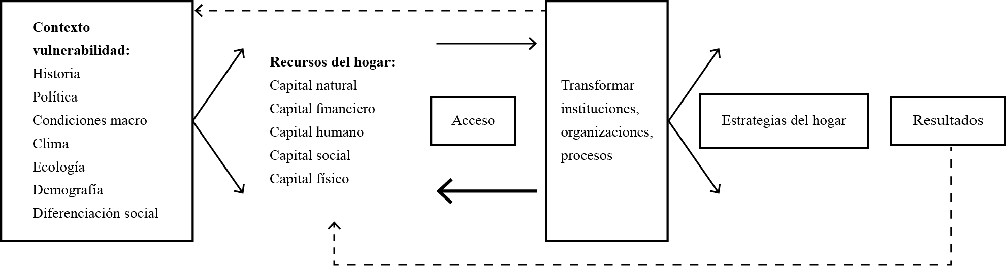 La migración favorece el tránsito de las personas entre diversos lugares, condiciones de vida (laborales y culturales), lo cual puede favorecer el desarrollo de algunos componentes que forman sus capacidades productivas y de sus hogares (humano, financiero, técnico, social) y determinan el tipo de vida que pueden lograr. Un modo de vida incluye las capacidades materiales y sociales del hogar que se desagregan bajo cinco formas de capital (social, humano, físico, financiero y natural), así como las actividades que pueden realizar y la forma en que acceden a ellas. Todo lo anterior enmarcado por las relaciones sociales e institucionales en el contexto de referencia (figura 1).