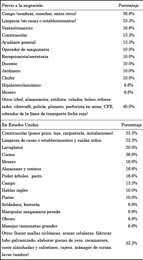 Quienes antes de migrar se dedicaban a las ventas o al comercio, en el extranjero se emplearon en actividades del campo, construcción, restaurantes, limpieza y jardineros. Los de construcción, se dedicaron a lo mismo, otros al campo o trabajar en restaurantes, en fábricas de pinturas y en almacenes. En general los oficios que desempeñaban en México, también fungieron como su principal actividad en Estados Unidos, aunque bajo otras normas, lo cual sugiere la importancia de contar con capacidades previas. Asimismo, otros migrantes desempeñaron oficios nuevos de mayor y menor calificación: el oficio de cocinero lo ejerció casi un tercio, eso implica calificación laboral, entrenamiento, capacitación, dominio de idioma y saber de procesos productivos y administrativos. Para llegar a ese puesto primero laboraron en otros de menor rango y eso refleja ascensos laborales en entornos de amplia dificultad.