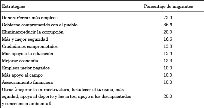 Los migrantes retornados también aportan opiniones desde su perspectiva y experiencias sobre lo que podría hacerse en la región para ampliar el campo de acción y aplicar sus conocimientos laborales. Los aportes se muestran en el cuadro 3. La clasificación porcentual es por estrategia y no todos alcanzan a formular alguna medida concreta. Algunas propuestas están centradas en la acción del agente externo que puede solucionar algo, pero otras mencionan la urgencia de participar cada ciudadano en la construcción de sus condiciones de vida. Por ejemplo, puede verse en orden de importancia que casi 75% de los migrantes considera que deben generarse más empleos, un tercio piensa que el gobierno debe mejorar sus prácticas y preocuparse más por el pueblo y 20% postula que el gobierno debe reducir la corrupción. De este modo, se señalan las cosas que funcionan mal.