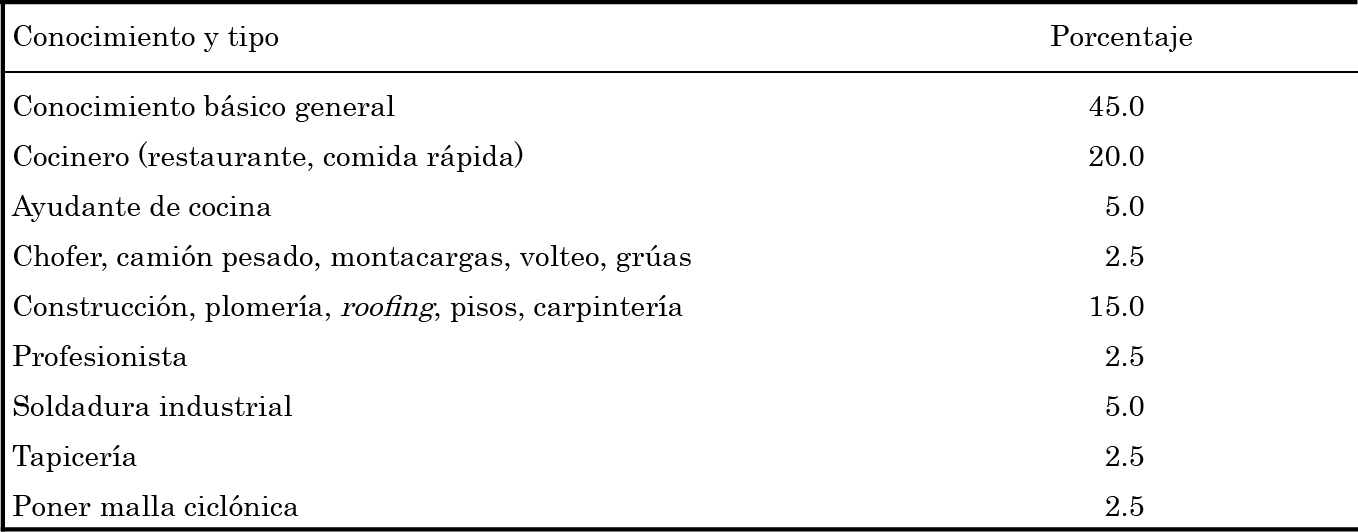 El conocimiento laboral que aprendieron en Estados Unidos y que trajeron consigo se muestra en el cuadro 2, aunque resulta difícil establecer porcentajes para cada conocimiento porque los migrantes traen más de uno, en este caso se toma en consideración aquel conocimiento laboral de mayor valor agregado. Puede notarse que casi la mitad de los migrantes trajo conocimiento laboral básico y los demás traen conocimiento de mayor valor agregado. Preparar comidas y dirigir la cocina de un restaurante son los principales conocimientos laborales calificados que traen al retorno a 20% de los migrantes. Al sumar a los ayudantes de cocina que realizaban tareas calificadas (5%), los conocimientos calificados en el área de restaurante reúnen una cuarta parte. El resto de conocimientos incluye una amplia variedad de cosas que los retornados pueden hacer en la región: labores de construcción especializada como el roofing y operar maquinaria pesada, entre otras, que suman casi otro 20%, además de la soldadura, uno más que es profesionista y otro que sabe instalar maya ciclónica.