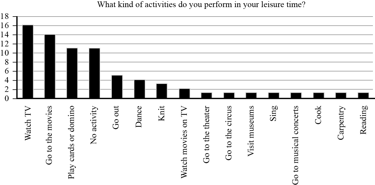 A research study profiling the Mexican context from a geriatric perspective, showed that family life and religious activities were the most frequent leisure pursuits, followed by relaxation, reading and watching television. Fewer activities such as going to the theater or cinema were reported (Guerrero et al., 2012).