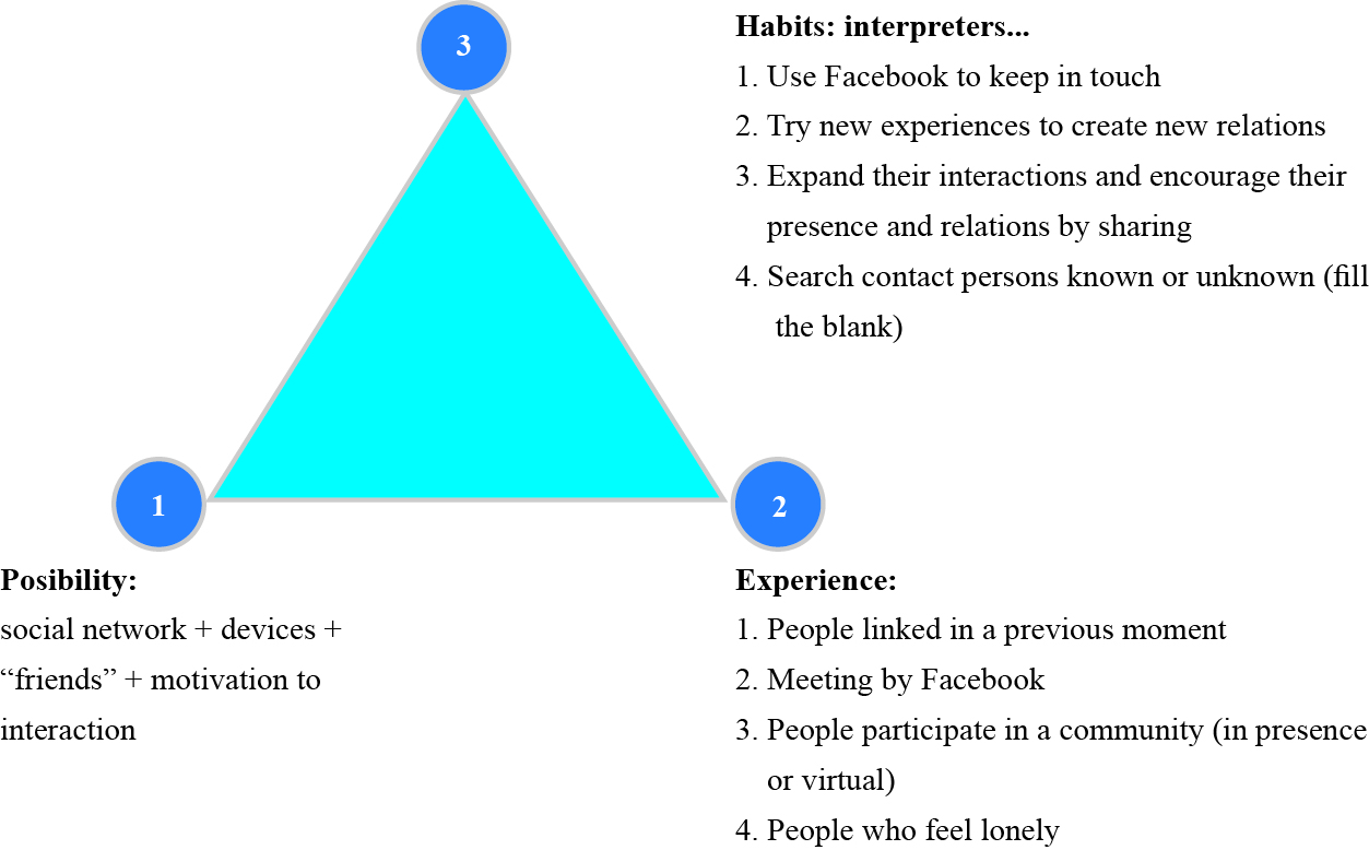 Social networks offer the possibility of interaction through a digital environment. Firstness, this category included the digital devices, the possibility to activate links with other people and the motivation to use the new resources. At Secondness, it is possible to identify that people had previously established relationships and Facebook functioned as a meeting point where elderly people participated in communities encouraging these relationships. Some interpreters used Facebook to avoid feelings of loneliness or boredom.