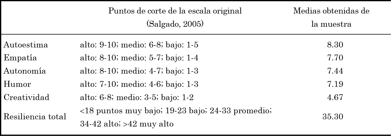Como se puede observar, las variables de autoestima, empatía, autonomía y creatividad de la muestra están en el rango de puntaje medio; en cambio, las variables de humor y resiliencia total en el rango alto.