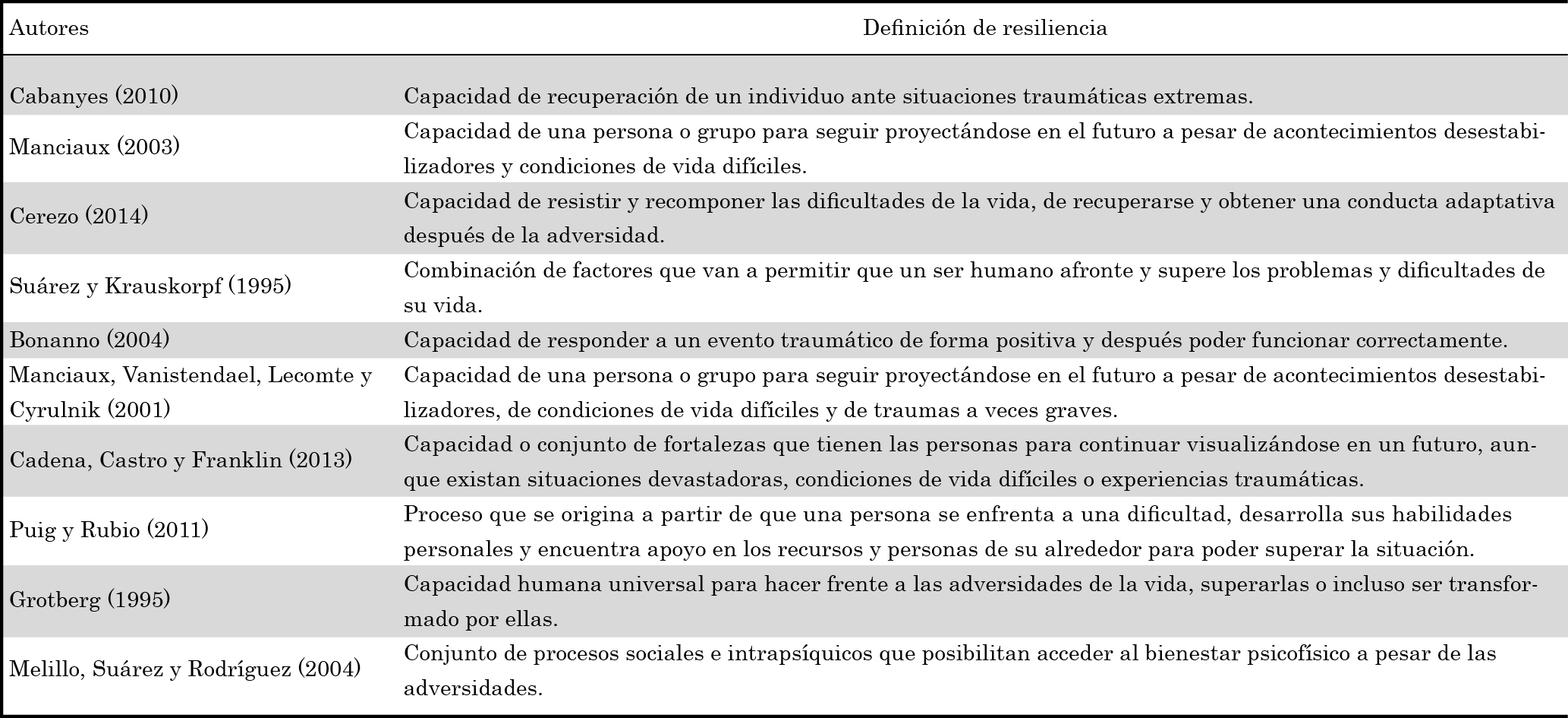 El término resiliencia tuvo su origen en la física y hacía referencia a la capacidad de un cuerpo de resistir, permanecer fuerte y no deformarse. Posteriormente, fue adaptado en ciencias sociales y de la salud como la capacidad de permanecer, crecer y salir con éxito de cualquier adversidad (Rutter, 1992). Y desde ese momento, varios autores han sugerido diferentes definiciones para este concepto, las cuales se enfocan en cómo los niños y jóvenes se desarrollan al momento de afrontar circunstancias problemáticas en las que se valorizan los aspectos positivos de la adaptación (Masten y Powell, 2003; Stein et al., 2000). Para ilustrar mejor, en la tabla 1 se condensan algunas definiciones de resiliencia propuestas en las últimas décadas.