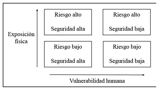 Si se analizan los listados de eventos ocurridos en el orbe mundial y en nuestro país, logran advertirse dos ejes comunes entre todos ellos: el primero se encuentra en la falta de conocimiento del entorno geográfico y, más grave aún, en la displicencia de los gobernantes y ocupantes del territorio. El modelo establecido por Smith y Petley (2007) explica de cierta forma la hipótesis propuesta debido a que exhibe la lógica relacionada entre la exposición física y la vulnerabilidad humana, la cual resulta de la correlación generada entre las condiciones de riesgo y de seguridad (figura 1).