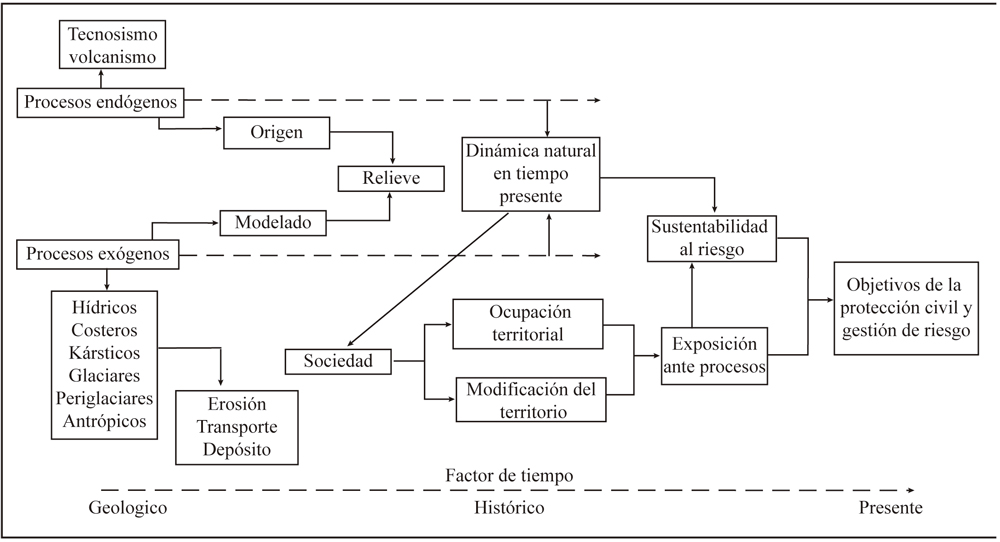 En la figura 2 se exhibe la relación sistémica desarrollada por los procesos naturales de origen y modelación del relieve con la ocupación del territorio a través del tiempo. En el caso de la tabla A1 (véase anexo) se muestra un concentrado de información de los elementos que estudia la geomorfología, el concepto general de cada uno de ellos y un ejemplo territorial en dónde se presentó un evento destacado.