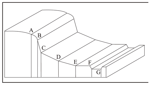 La figura 3 exhibe un esquema que explica la tesis anterior en el cual se advierten secciones con manifestaciones geométricas del relieve observado a través de la pendiente general del terreno y la correlación con diferentes procesos asociados al desarrollo de vertientes. Las letras en la base del esquema representan los sectores del perfil y el conjunto de procesos relacionados con su geometría. Destaca los de origen fluvial, remoción en masa, inundación y subsidencia.
