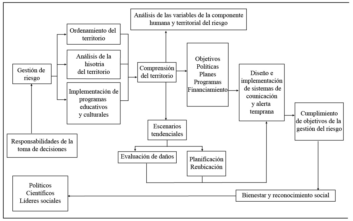 En la figura 5 se manifiesta una estructura idealizada en la cual se representan los elementos básicos que la gestión del riesgo debe poseer. Comienza por la ordenación del territorio y culmina con la consecución de los objetivos propios del asistencia que se ofrece, el bienestar social y el reconocimiento público de la población a quienes se responsabilizan por la decisión consciente desde el lugar que ocupan en la jerarquía del servicio que se otorga.
