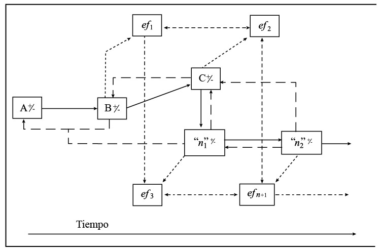 Nota: se muestra la complejidad de funcionamiento y correlacionalidad de los geosistemas perturbadores en donde: A, B, C y n1 representan variables de los procesos y ef el conjunto de efectos generados por cada variable. Las flechas continuas representan las variables de impacto directo, mientras que las discontinuas las de posibilidad.