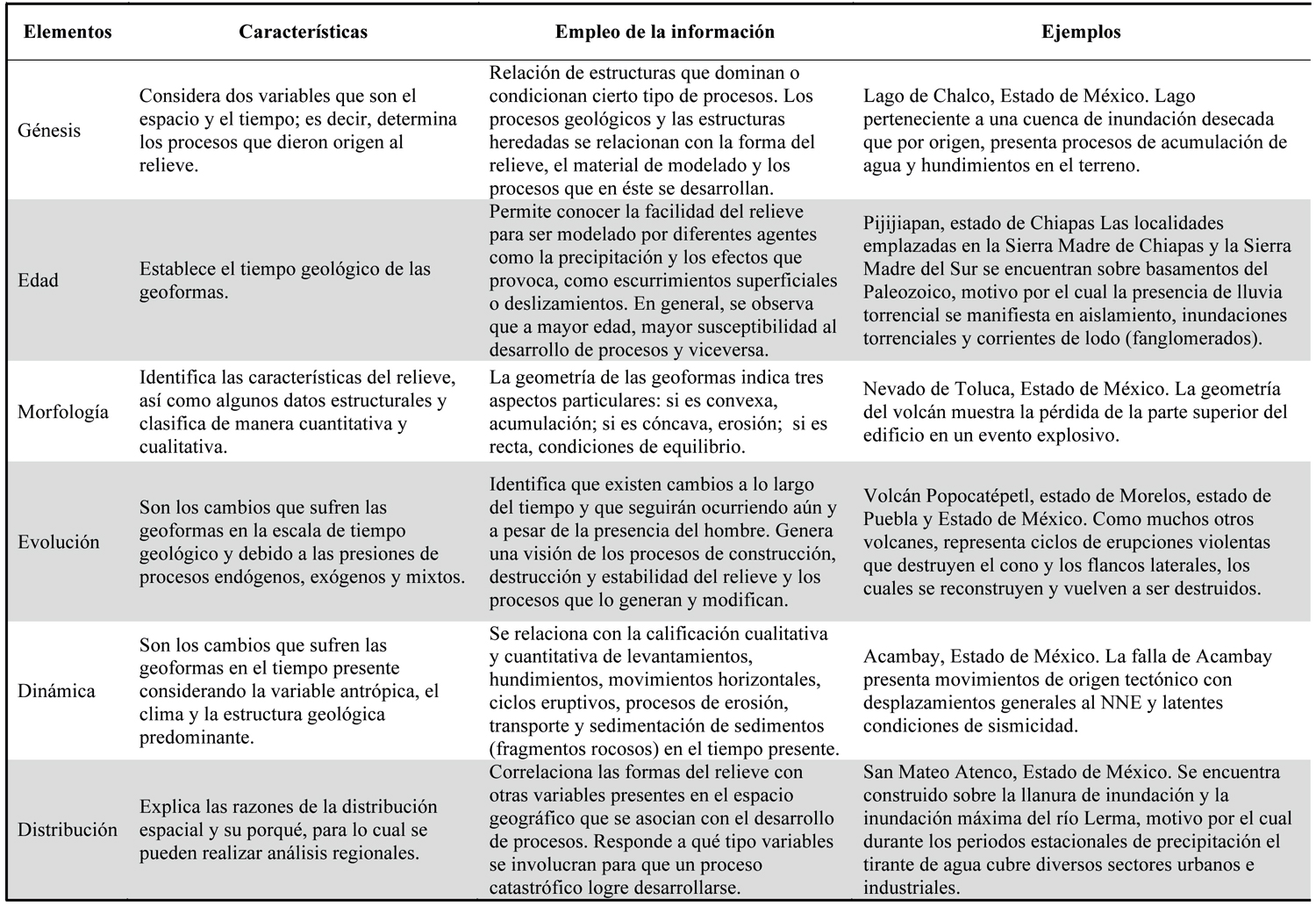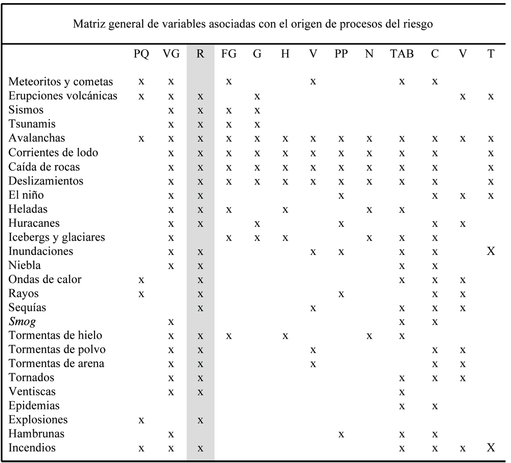 Fuente: modificado de De Pedraza (1997).En la matriz se muestra con un listado de procesos asociados al riesgo más comunes que han afectado la faz de la Tierra desde que se formó y la tipología de las variables que se entrelazan para configurar un escenario de riesgo (tabla A2, véase anexo), en donde la columna de relieve ha sido señalada con un fondo de color gris.