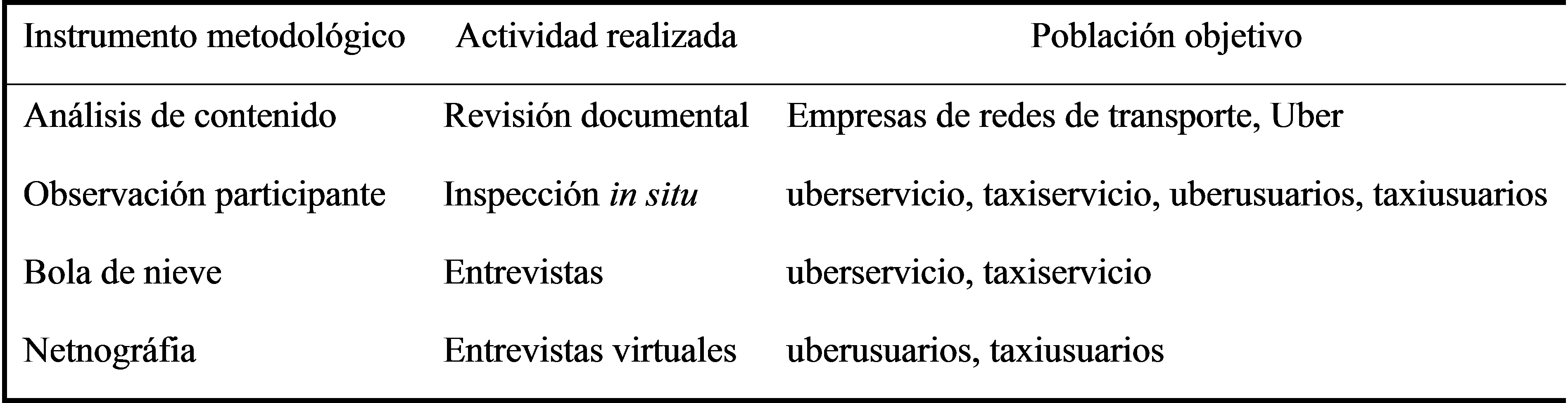 Metodológicamente se ha inspeccionado el nacimiento, funcionamiento, proliferación, aceptación y rechazo de la empresa Uber en el AMG con base en la revisión y análisis de contenidos temáticos, los cuales han sido complementados con un trabajo de campo utilizando la técnica cualitativa de la bola de nieve y un ejercicio netnográfico en la red social Facebook. Las entrevistas fueron realizadas de forma selectiva, tanto para los socios prestadores del uberservicio como para los prestadores del servicio tipo taxi y los usuarios de ambos servicios. En función de esto último, ha sido posible observar diversos escenarios del cibernauta urbano, tanto el que simpatiza con el ciberservicio en general y el uberservicio en particular como el que ha expresado abiertamente su rechazo al proceso de uberficación en la metrópoli, es decir, a la expansión metropolitana de la empresa Uber. De esta forma, el trabajo fue estructurado en cuatro apartados.