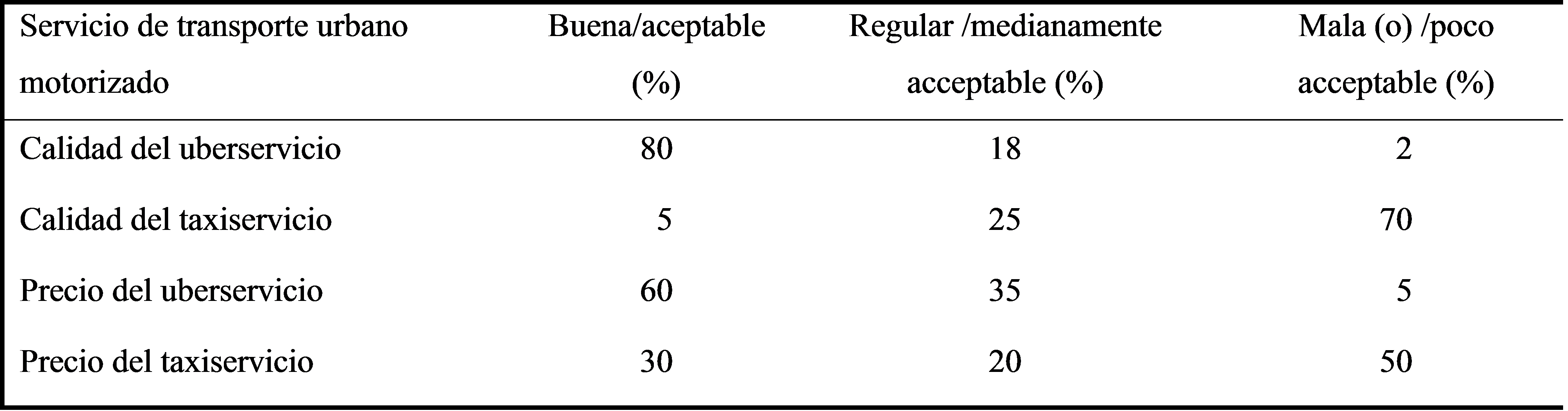 En el ejercicio netnográfico se seleccionó una muestra inicial de cibernautas urbanos (50 invitados), que se fue nutriendo en una cadena de recomendaciones hasta conformar un bola de nieve interesante de uberusuarios y taxiusuarios. Estos fueron cuestionados sobre la calidad, ventajas y desventajas del uberservicio y el taxiservicio (473 entrevistados en total). Con base en los resultados de sus respuestas, existe convergencia de la muestra en torno a que Uber vino a revolucionar el servicio del transporte urbano motorizado y los esquemas tradicionales en la forma de prestar el servicio (cuadro 1).