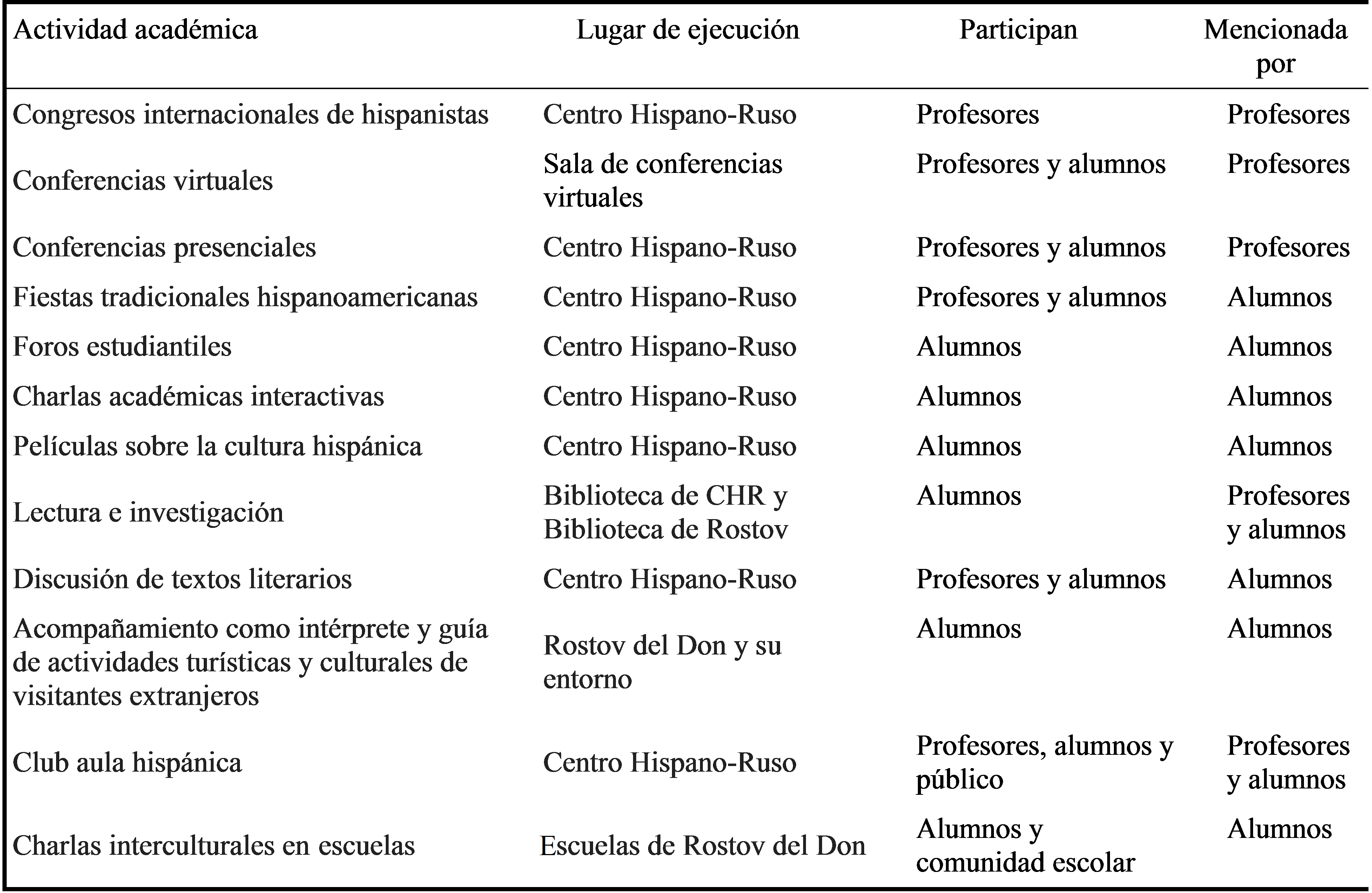 Para fortalecer la formación de los profesores, ellos mencionaron que se realizan en el Centro Hispano-Ruso dos congresos internacionales de hispanistas por año, además de conferencias virtuales y presenciales. Los estudiantes mencionaron que se llevan a cabo constantemente conferencias internacionales, foros estudiantiles, charlas académicas interactivas, presentación de películas sobre la cultura hispánica y el club Aula Hispánica, que cuenta con la participación de estudiantes rusos y latinoamericanos. Las actividades didácticas en aula, según manifestaron los profesores, comprenden clases de español, cultura hispánica, historia de los pueblos hispanohablantes, traducción socio-política, entre otras. Estos datos aportados por los profesores fueron contrastados con las observaciones y los datos aportados por los alumnos, que además agregaron algunas actividades extracurriculares, como el acompañamiento a visitantes hispanohablantes, en calidad de intérpretes y guías, en los sitios turísticos y culturales de Rostov del Don y su entorno. La tabla 1 presenta una síntesis integrada de las actividades didácticas orientadas al desarrollo de la inteligencia cultural.