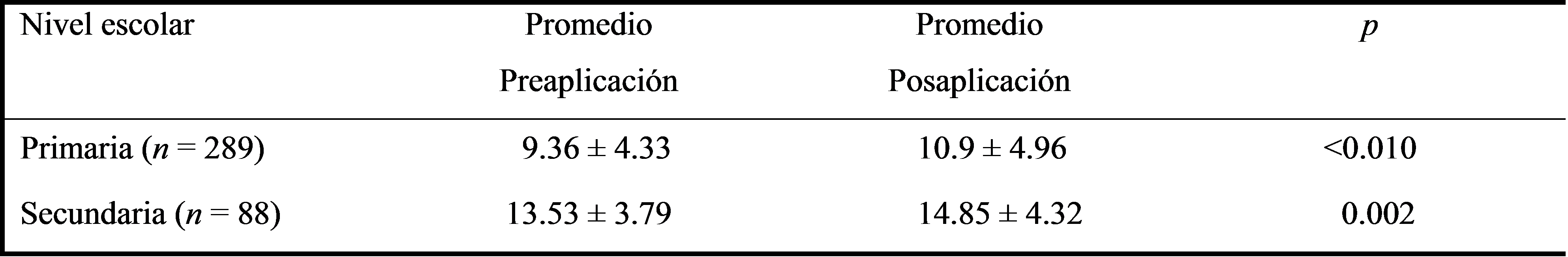 En el cuadro 1 se muestra una comparación de primaria y secundaria, donde se observó que en la pre y posaplicación de ambos niveles académicos existe diferencia significativa en el incremento de aciertos. En secundaria se presentó una mayor puntuación en pre y posaplicación.