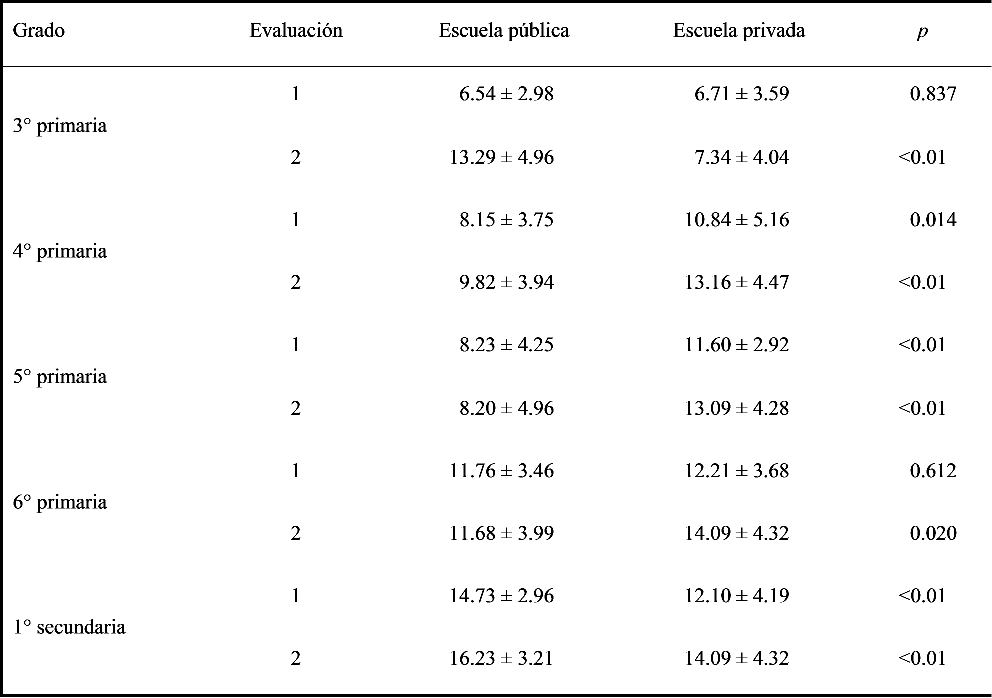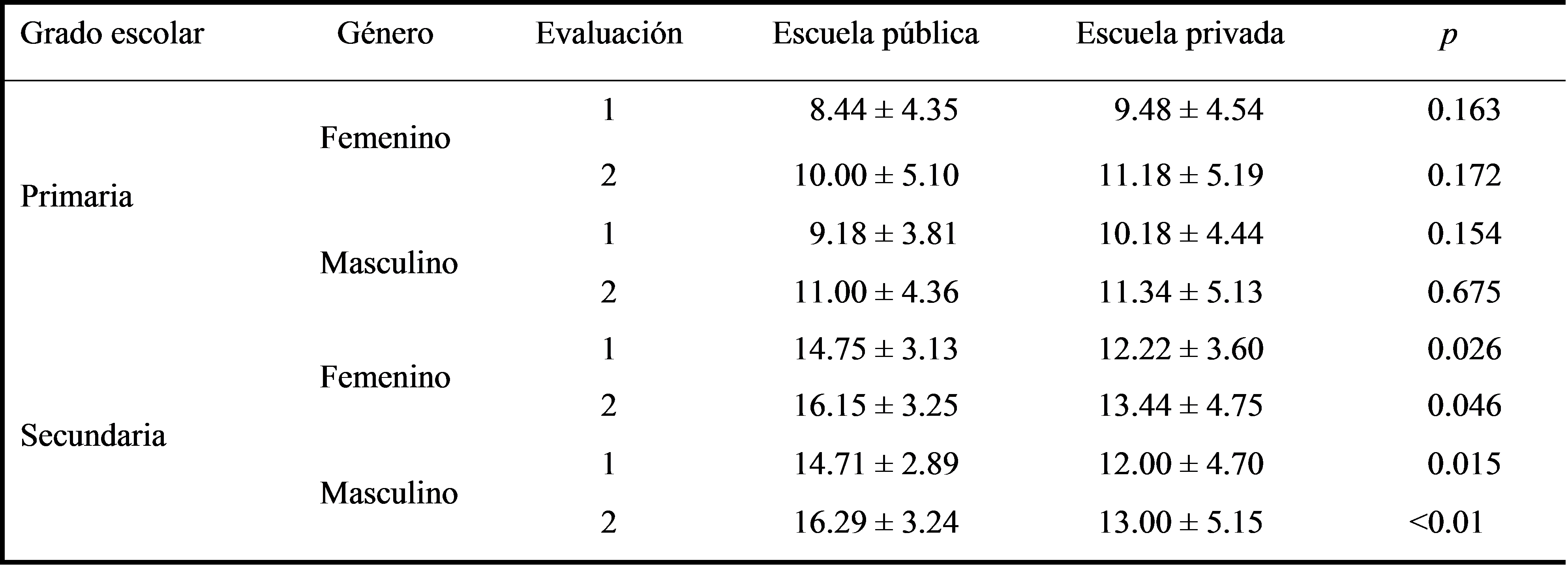 El mayor puntaje de conocimiento se observó en las niñas de las escuelas privadas de nivel primaria tanto pre como posaplicación y a nivel secundaria el mayor puntaje fue en las escuelas públicas en ambos géneros (p < 0.05) de acuerdo con el cuadro 3. En general, el aumento en el puntaje de conocimientos entre la pre y posaplicación del juego en ambas escuelas fue similar. Sin embargo, se muestra que en estudiantes de secundaria es mayor en las escuelas públicas pre y posaplicación, contrario a lo que menciona Larrañaga y Rodríguez (2014) referente a que las escuelas privadas presentan mayor calidad de enseñanza en general.