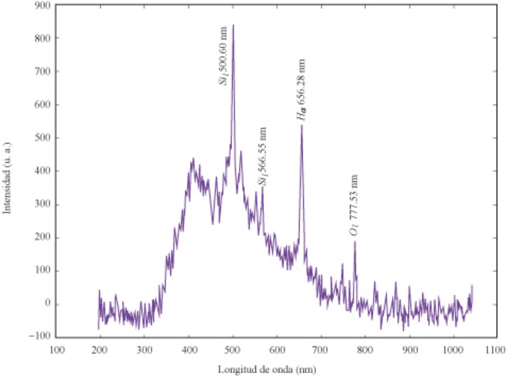 El espectro de un plasma representa una huella digital elemental única (o “firma”) de las especies químicas en la muestra. Esto es debido a que todos los elementos de la tabla periódica emiten luz con ciertas longitudes de onda que los caracterizan, cuando son excitados. Dichas líneas espectrales, como las que se muestran en la gráfica 1, se caracterizan por la a) longitud de onda, b) intensidad y c) forma. Estas propiedades son dependientes de la estructura de los átomos que emiten, así como del ambiente. En la gráfica 1 se observa también una gran contribución de emisión continua que se superpone a las lineas espectrales, que puede reducirse para mejorar el límite de detección tal como ha sido reportado por Sobral et al. (2012).