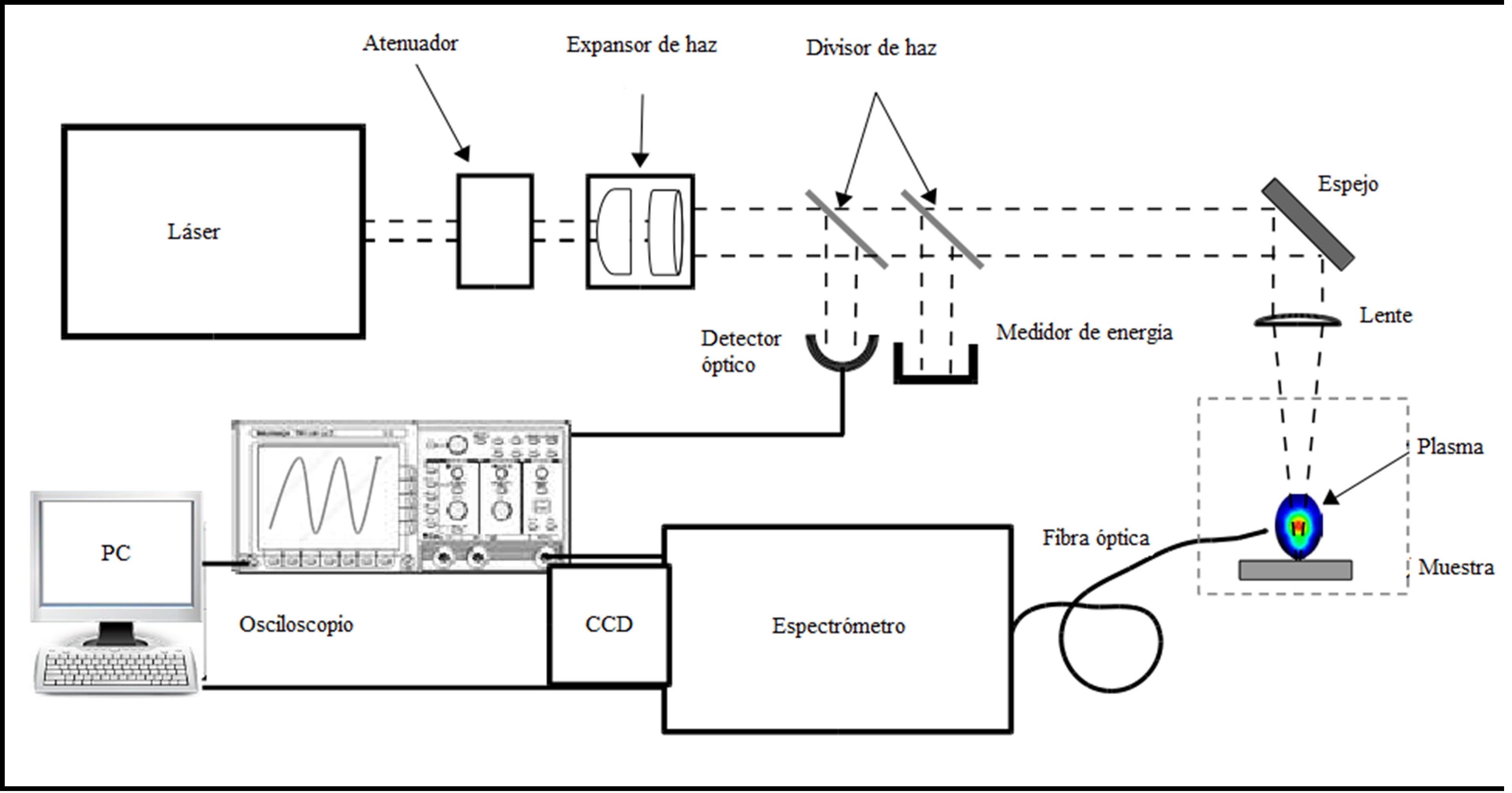 La instrumentación principal y los componentes básicos que se requieren para realizar análisis a través del método de LIBS se muestran esquemáticamente en la figura 1. Se requiere de un láser de alta energía que emita pulsos de corta duración, una lente de enfoque, la óptica necesaria para recolectar la radiación emitida, un analizador de longitudes de onda y un detector, los cuales son controlados por computadora. Los láseres más utilizados son aquellos que operan en la escala de nanosegundos, por ejemplo los Q-switched Nd:YAG tienen su frecuencia fundamental correspondiente a 1 064 nm, o en sus armónicos a 532 nm, 355 nm y 266 nm. También son empleados comúnmente los de gas tipo excímero que emite a 193 nm, 248 nm, 308 nm. Se usan láseres en la escala de microsegundos (10.6 μm CO2 laser), y con el desarrollo de las nuevas tecnologías incluso de picosegundos y femtosegundos.