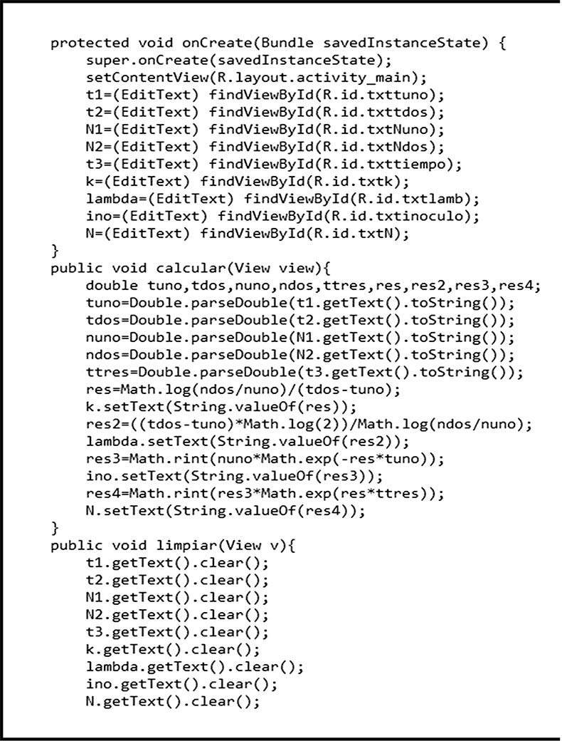 Mediante el paradigma de la POO (programación orientada a objetos) se escribe una aplicación móvil para el SO Android empleando el entorno de desarrollo Android Studio, el cual utiliza el entorno gráfico en lenguaje XML y el lenguaje Java para la implementación de los cálculos en las ecuaciones 7, 9 y 10 y con esta información calcule la cantidad de microrganismos a otro tiempo.