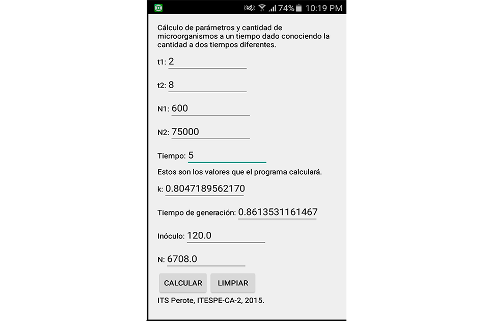Resumen: Se muestra el desarrollo de una aplicación móvil para el sistema operativo Android, que calcula diversos parámetros del modelo exponencial (o malthusiano) si se conoce la cantidad de microrganismos en dos tiempos diferentes. A partir de la solución de una ecuación diferencial y de las propiedades de la función exponencial, se programa un botón para determinar la constante de crecimiento, el tiempo de duplicación, la población inicial y la cantidad que habrá a un tiempo diferente, con los datos ingresados por el usuario. Con un ejemplo se muestra la validez de los resultados de la aplicación al compararlos con los que se obtienen manualmente.