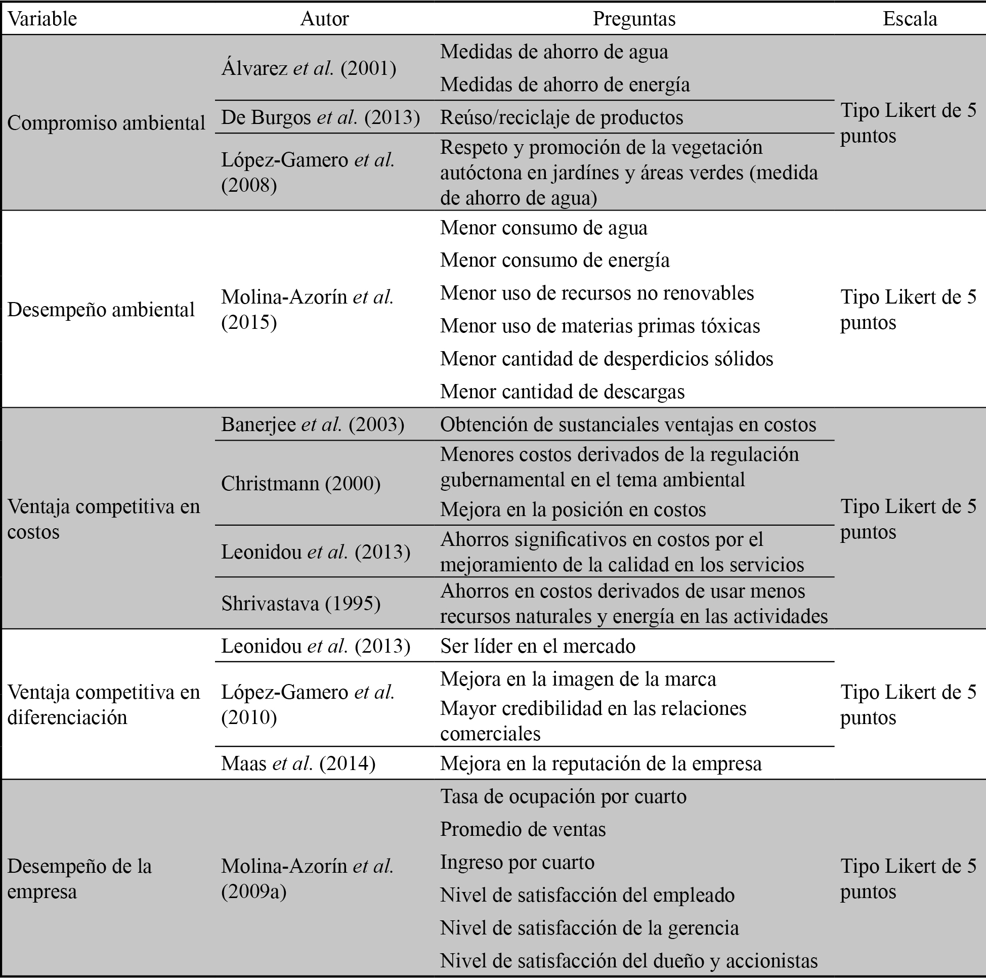 Para medir el compromiso ambiental se emplearon cuatro preguntas de la literatura de gestión ambiental (Álvarez et al., 2001; De Burgos et al., 2013; López-Gamero et al., 2008). Para medir el desempeño ambiental, se utilizaron seis preguntas de Molina-Azorín et al. (2015). Con el objetivo de medir la ventaja competitiva en costos se emplearon cinco preguntas de la literatura académica de gestión ambiental (Banerjee et al., 2003; Christmann, 2000; Leonidou et al., 2013; Shrivastava, 1995). Para medir una ventaja competitiva en diferenciación se utilizaron cuatro preguntas de la literatura académica (Leonidou et al., 2013; López-Gamero et al., 2010; Maas et al., 2014). Finalmente, para medir la variable desempeño del hotel se emplearon seis preguntas de Molina-Azorín et al. (2009a) (tabla 1).
