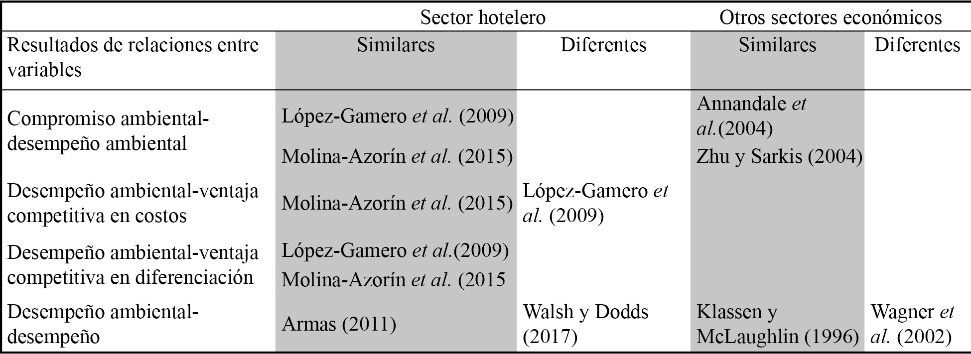 En el marco de los estudios en el sector hotelero, estos resultados coinciden con Molina et al. (2015) al hallar resultados similares al indicar que el desempeño ambiental contribuye a alcanzar una ventaja competitiva en costos, pero no concuerdan con López-Gamero et al. (2009), quienes hallaron una relación negativa y no significativa entre estas variables (tabla 2).
