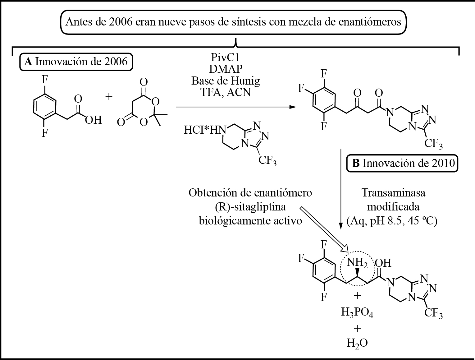 Otro caso de interés para el lector, pero ahora enfocado en la vía de la evolución dirigida, es la ruta de síntesis de la sitagliptina, un fármaco para el tratamiento de la diabetes tipo 2 (Thomson y Vallon, 2018). Antes de 2006, su síntesis consistía en nueve pasos con diferentes reacciones, solventes y reactivos, prolongado tiempo de reacción y purificación, y una falta de pureza enantiomérica (Mallela et al., 2013). Por fortuna, en 2006 se implementó un nuevo proceso de síntesis química de tres pasos que redujo tiempo y procesos de purificación. Posteriormente, y de mayor interés para este artículo, en 2010 el proceso otra vez fue innovado a una síntesis química-biotecnológica mediante la evolución de una enzima transaminasa, a la cual se le desarrolló la actividad catalítica para la hidrogenación asimétrica de una enamina (figura 2). El gen de dicha enzima fue mutado aleatoriamente siguiendo una cuidadosa selección en cada ciclo de acuerdo con las condiciones de interés. El proceso de variación-selección se realizó por once ciclos hasta obtener una proteína (con 27 mutaciones) de una actividad de más de 80 % y 99% de enantioselectividad (Valavanidis, 2017).