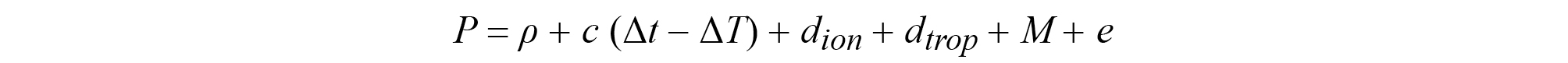 Dónde: P es el pseudorango; ρ es la distancia geométrica al satélite; c la velocidad de la luz; Δt y ΔT es la diferencia del tiempo entre el reloj del satélite y el receptor en tiempo GPS; diony dtrop son los retardos provocados por la ionósfera y la tropósfera; M es el efecto de la multitrayectoria; е es el ruido del receptor.