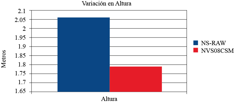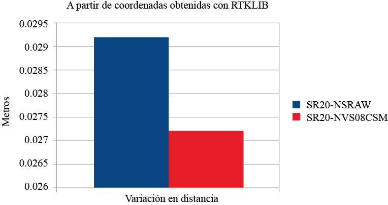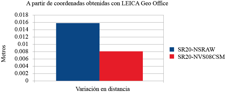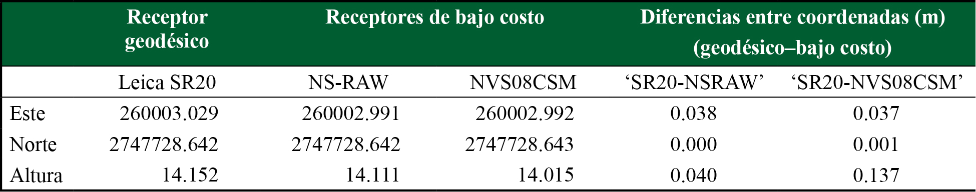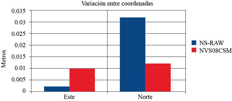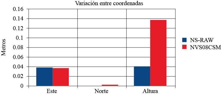 Como resultado de las campañas de medición, se observó que es posible implementar los receptores de bajo costo en trabajos topográficos referentes al plano horizontal y descartar el plano vertical dado los resultados obtenidos. Las observaciones GPS se evaluaron mediante las desviaciones estándar, coordenadas y las distancias calculadas, las cuales fueron contrastadas con un receptor geodésico de una frecuencia (considerando este como punto de partida). Las coordenadas calculadas a partir de las observaciones GPS se llevaron a cabo mediante el software RTKLIB para ambos receptores de bajo costo en una proyección Universal Transversa de Mercator (UTM), zona 13 Norte. En lo referente al receptor NVS08CSM, los resultados muestran una diferencia de ≅3 cm para las componentes Norte y Este, donde destaca una variación máxima de ≅14 cm para la componente Altura (cuadro 1, gráfica 1). Al igual que para el receptor NSRAW, las diferencias son consistentes en las componentes horizontales y no existe discrepancia significativa en cuanto al receptor NVS08CSM; de acuerdo con Andrei (2012), este comportamiento puede deberse a la resolución de las ambigüedades, lo cual se estima que genera hasta 15 cm de inestabilidad en el posicionamiento.