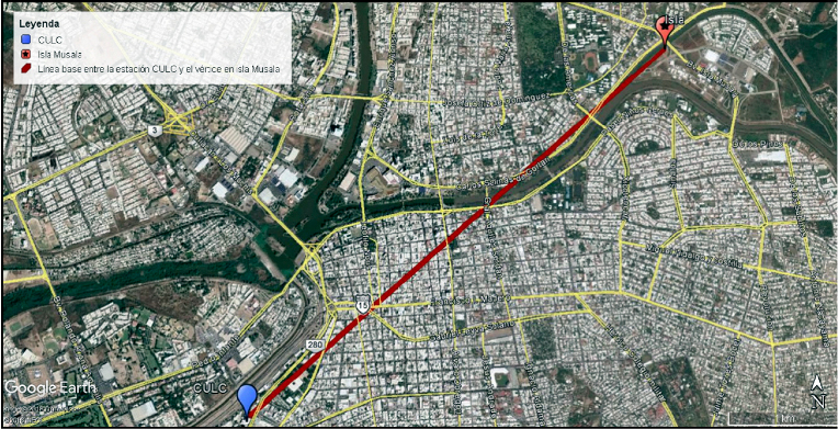 La experimentación se llevó a cabo en el sector Isla Musala (mapa 2), al noroeste de la ciudad de Culiacán. La estación de prueba fue colocada en esta zona, ya que representa un área sin urbanización y sin vías de tránsito que atraviesen el área de experimentación; además, la distancia en línea recta a la estación de referencia CULC (mapa 3) es de aproximadamente 5.1 km que de acuerdo con el método de posicionamiento diferencial se recomiendan distancias igual o menores a 10 km (Takasu y Yasuda, 2013).