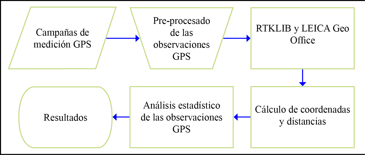 El proceso de experimentación fue llevado a cabo siguiendo las etapas expuestas en la figura 1. En primera instancia se realizaron tres campañas de medición en diferentes días con diferentes equipos con la finalidad de establecer tres líneas bases geodésicas y compararlas en cuanto a sus coordenadas y distancias obtenidas.