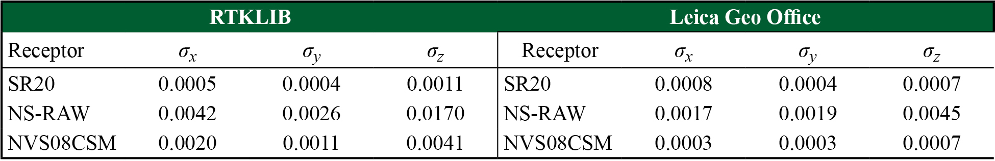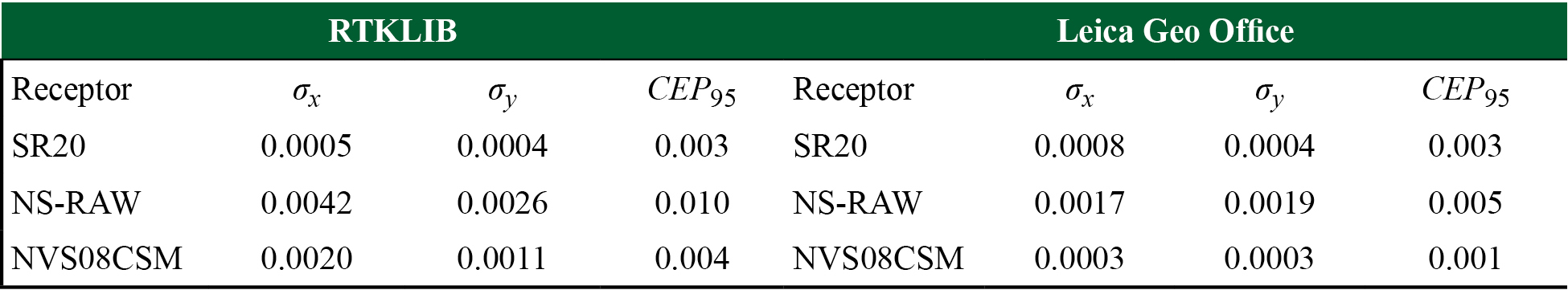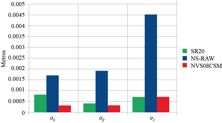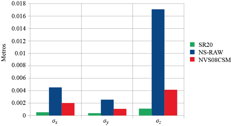 Como último parámetro de evaluación, se describió la desviación estándar de las mediciones obtenidas como resultado del procesamiento. En el cuadro 5, gráficas 6 y 7 se presentan las desviaciones estándar que resultaron del postprocesamiento con una precisión en el orden de décimas de milímetros en la componente horizontal. Sin embargo, para el caso de la vertical, sigue siendo considerablemente de menor precisión para los receptores de bajo costo al ser comparados con un receptor de una frecuencia. Esto está relacionado con lo descrito: dado que es sensible al efecto multitrayectoria y parámetros de antena, dificulta la estimación de la altura; los resultados muestran que en ambos software la componente vertical para el caso de los receptores de bajo costo es la de menor precisión.