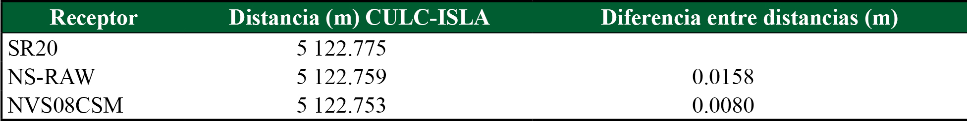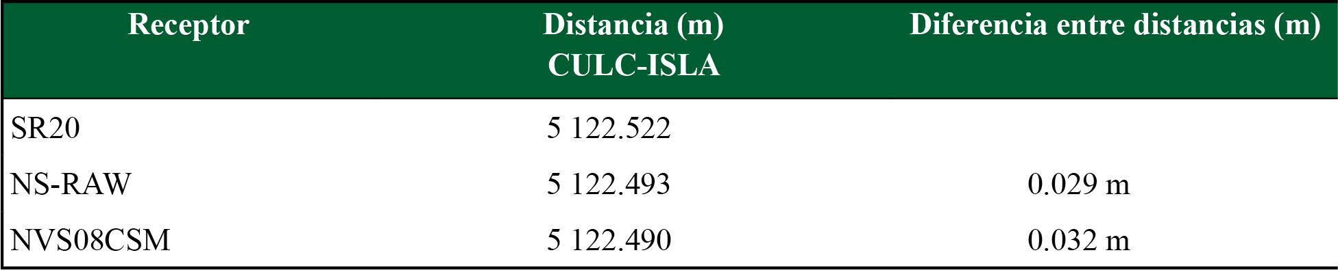 Otro cálculo referente a una línea base geodésica es la distancia, la cual es estimada entre ambos receptores. Como producto de la obtención de coordenadas, se calcularon las distancias de la línea base geodésica (CULC-Isla Musala) a partir de los resultados del software RTKLIB y Leica Geo Office. Las diferencias entre las distancias calculadas con las coordenadas obtenidas con el software RTKLIB se encuentran en el orden de los 3 cm entre los receptores de bajo costo (cuadro 3 y gráfica 4) en una distancia de 5.122 km de la estación por estimar a la de referencia continua. En comparación con las distancias y diferencias obtenidas al calcular con el software Leica Geo Office (cuadro 4 y gráfica 5) existe una disminución en las discrepancias entre las distancias que se aproximan al centímetro, lo cual hace referencia a que las coordenadas provenientes de los cálculos con el software Leica Geo Office son precisas en consideración de las obtenidas con el software RTKLIB debido al manejo de los modelos y parámetros; la técnica diferencial es una debilidad misma en el software.