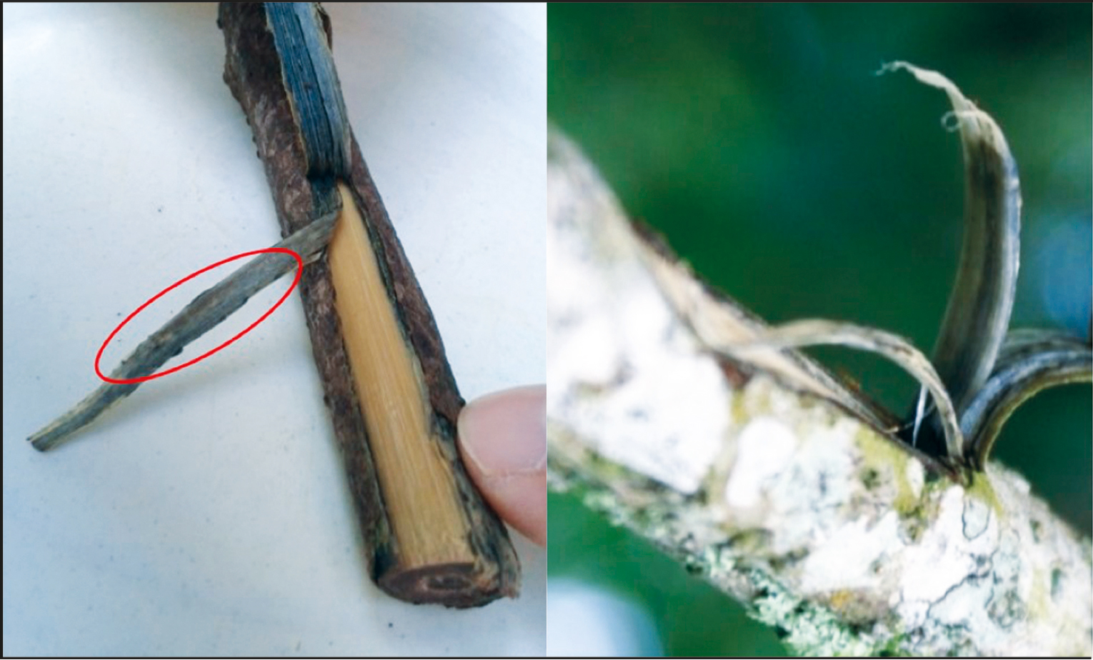 En este artículo se encontró que la parte comestible de S. scandens es el cámbium vascular del tallo, también conocido como “carne, tela o yaco” (figura 1). Para obtener el cámbium se tiene que retirar la peridermis (figura 2). Las personas lo consumen hervido (82%), crudo (16%) y asado (2%); la forma hervida es la más fácil para desprender el cámbium. La especie es utilizada como sustituto del picante y agente saborizante como lo indican Villa-Ruano et al. (2015), además de consumirse en comidas típicas con frijoles (Phaseolus vulgaris L.), chepiles (Crotalaria longirostrata Hook & Arn) o como acompañamiento de cualquier otro alimento.