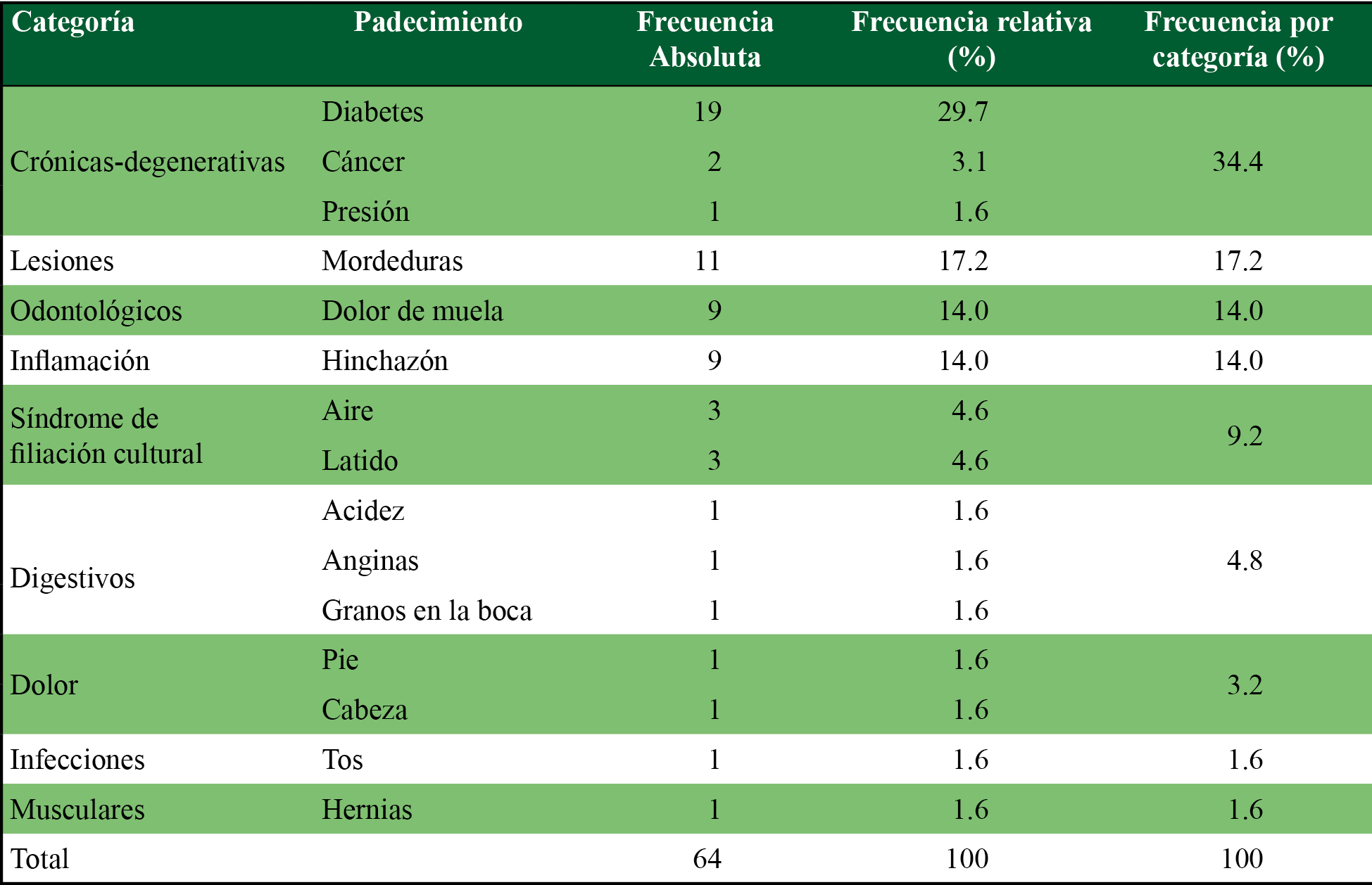 De los padecimientos en seres humanos tratados con S. scandens se detectaron 15, clasificados en 9 categorías (cuadro 1), de las cuales las crónico-degenerativas mostraron la mayor frecuencia (34.4%); dentro de esta categoría, la diabetes fue la más reportada (29.7%). La planta puede tener diferentes usos: con los tallos se elabora una infusión y se toma como “agua de uso diario” para controlar la diabetes; el cámbium vascular se coloca en la muela que adolece para disminuir el dolor; para curar la mordedura de serpientes, de perro y piquete de alacrán se muelen las hojas y se aplica la mezcla directamente en la herida; para la disminución de la hinchazón en los pies, éstos se sumergen en un recipiente con infusión de hojas y tallos. De Feo (2003) afirma que esta planta es efectiva en el tratamiento de la esterilidad femenina si se bebe de dos a tres tazas al día de una infusión de hoja fresca (aproximadamente 50 g en 1 l de agua); sin embargo, este uso no fue reportado por las personas entrevistadas de la localidad.