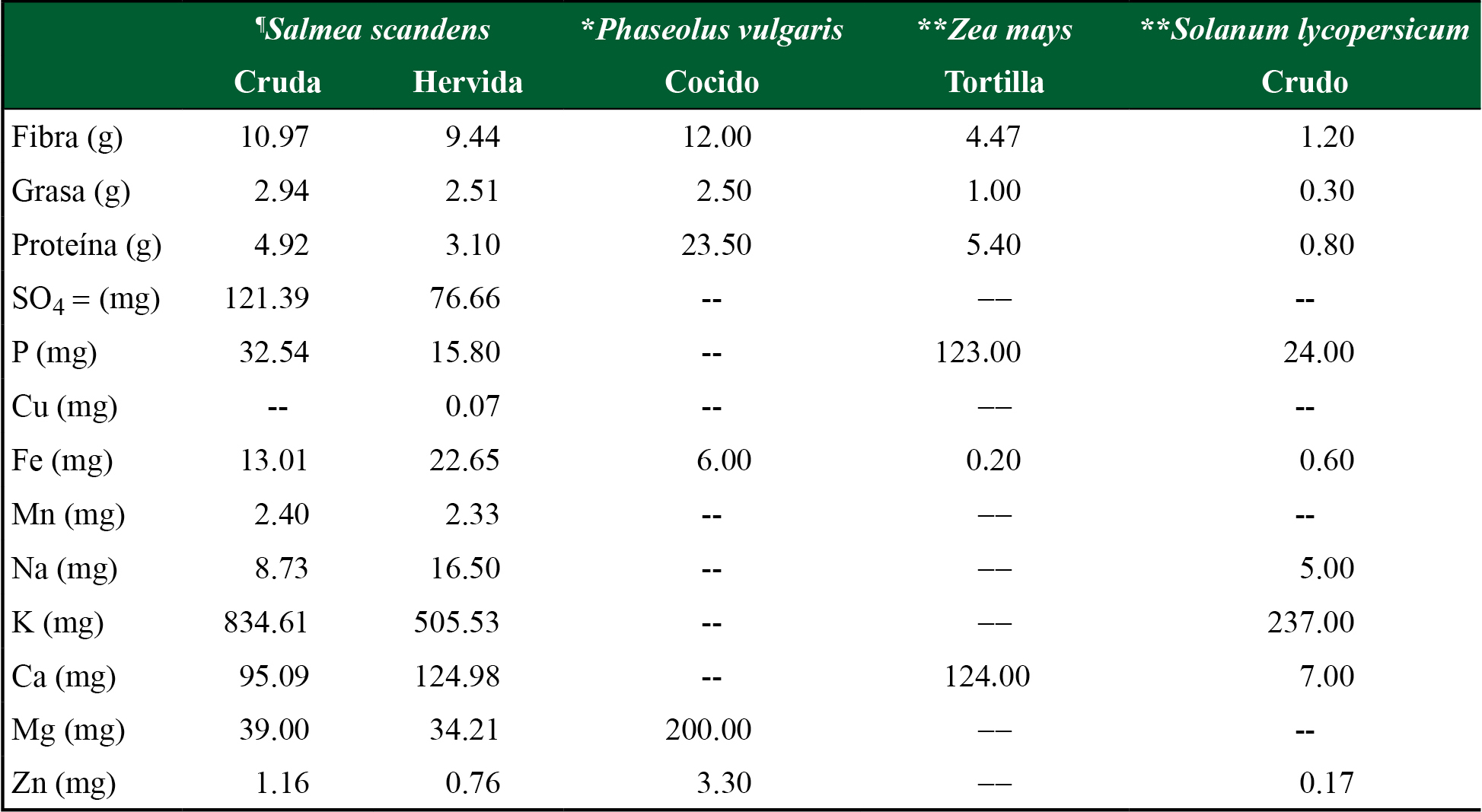 Referente al contenido mineral en otros cultivos, se encontró que la cantidad de P y Ca es mayor en Z. mays respecto a S. scandens y S. lycopersicum; en contenido de Na, Fe y K, S. scandens es mayor que P. vulgaris y S. lycopersicum y en contenido de Zn, S. scandens es menor que P. vulgaris y es mayor respecto a S. lycopersicum. Latham (2002) señala que los elementos trazas son necesarios, pero en cantidades mucho menores (menos de 100 mg/día), dentro de los cuales se encuentran el Zn, Cu y Mn. García (2006) menciona que la ingesta diaria recomendada de Fe y Zn es de 14 y 15 mg respectivamente. La FAO (2006) recomienda la ingesta diaria de Fe, en mujeres de 11-29 mg y en hombres 14 mg. Como se observa en el cuadro 2, los alimentos mencionados presentan las cantidades de ingesta recomendadas; en el caso particular del Fe, 100 gramos de S. scandens cruda o cocida proporcionan por sí mismas el requerimiento diario de este mineral con una concentración superior a la del frijol, la tortilla y el tomate. Asimismo, respecto al Ca y K, Latham (2002) propone ingerir más de 100 mg/día, cantidad que S. scandens aporta cuando se consume acompañada de otros alimentos. La mayoría de las veces complementa el requerimiento de ingesta diario para estos minerales.